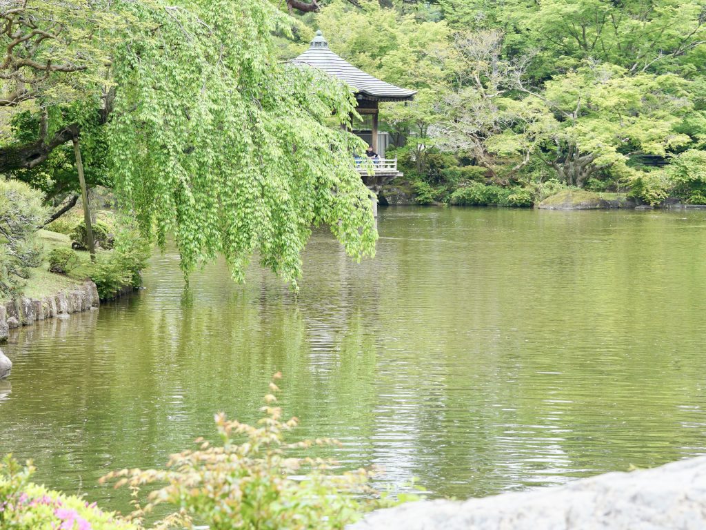 青々としたもみじ、まだ柔らかい新緑たちが、陽の光を受けてきらきらと輝いていました。池のほとりには、石橋や飛び石が配置され、水面に映る空と木々のグラデーションがとてもきれい。